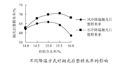不同的降溫方式對大米加工機(jī)械出品整米率的影響。糙米在經(jīng)大米加工設(shè)備碾白的過程中由于受到擦離摩擦以及碾削等作用力而導(dǎo)致米溫升高的現(xiàn)象,如果對溫度較高的大米直接進(jìn)行拋光等處理不僅會增加能耗,還會降低碎米率,因此,需要對出機(jī)的高溫米粒進(jìn)行降溫。降溫的方式主要有兩種:水冷降溫和風(fēng)冷降溫,這兩種降溫方式對大米加工機(jī)械整米率的影響結(jié)果如下圖所示: